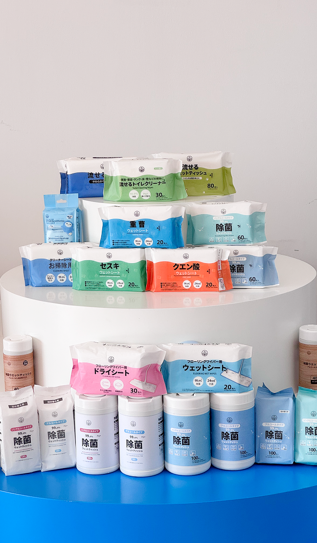 日常生活からケアシーン、さらに介護・医療現場に至るまで ——当社は「除菌シート」「フローリングシート」「ウェットティッシュ」「メイク落としシート」「クレンジングシート」といった多岐にわたるウェットティッシュ製品群を開発・製造し、あらゆる場面で清潔と衛生をサポートします。